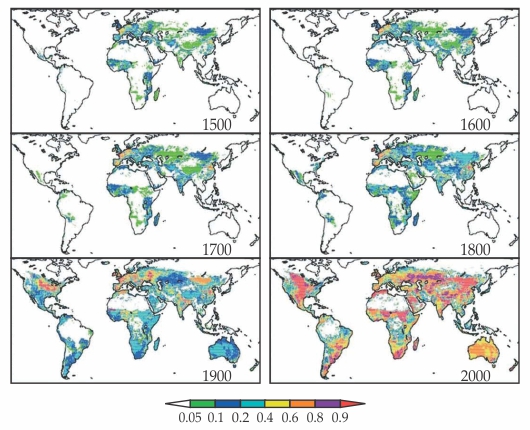 Figure 3. Earth’s natural landscape has been increasingly converted to cropland and pasture over the past 500 years. The color key gives the local relative fraction of land converted to agricultural use. The analysis techniques used to create the map continue to undergo refinement. For example, in Australia too much landscape is shown as pasture. (Adapted from ref. 5.)
