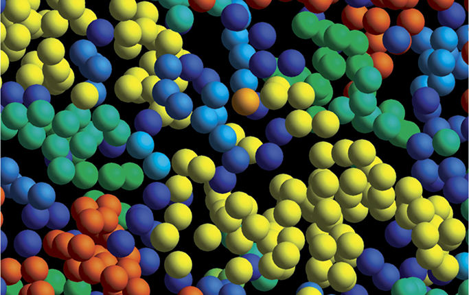 Toothpaste, yogurt, paint, and many other common materials are colloidal gels, in which solid particles are dispersed in a liquid. In this simulation of a colloidal gel deformed with large amplitude oscillatory shear, colors indicate clusters of colloidal particles. (Courtesy of Jun Dong Park, University of Illinois at Urbana-Champaign.)