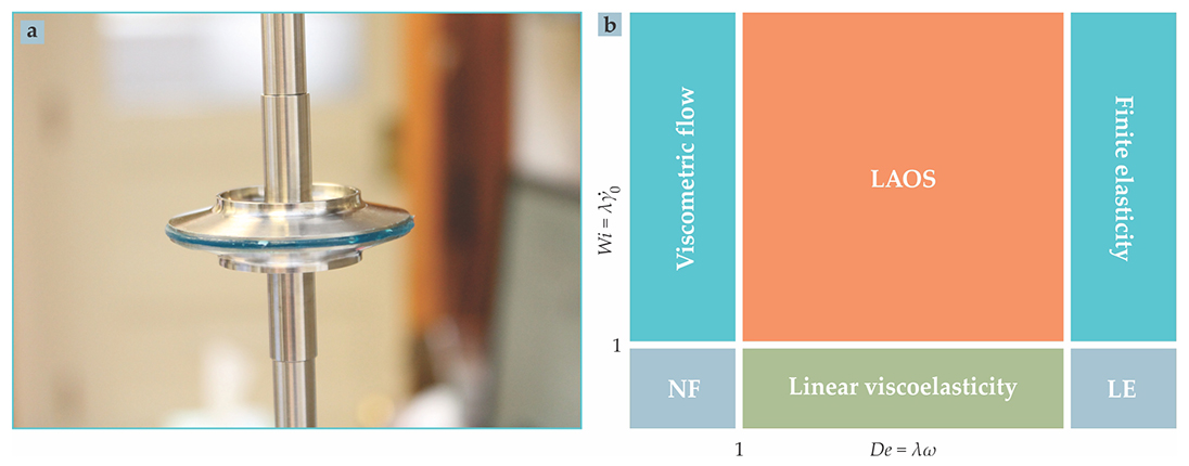 At the heart of a typical rheometer (a) is a working fluid, here a variety of blue Colgate MaxFresh toothpaste, sandwiched between a lower plate and an upper surface that apply a shear strain. A transducer located above the frame of the photo converts the fluid’s stress response into a measurable electronic signal. (b) Oscillatory shearing is described by two parameters with units of inverse seconds, the amplitude