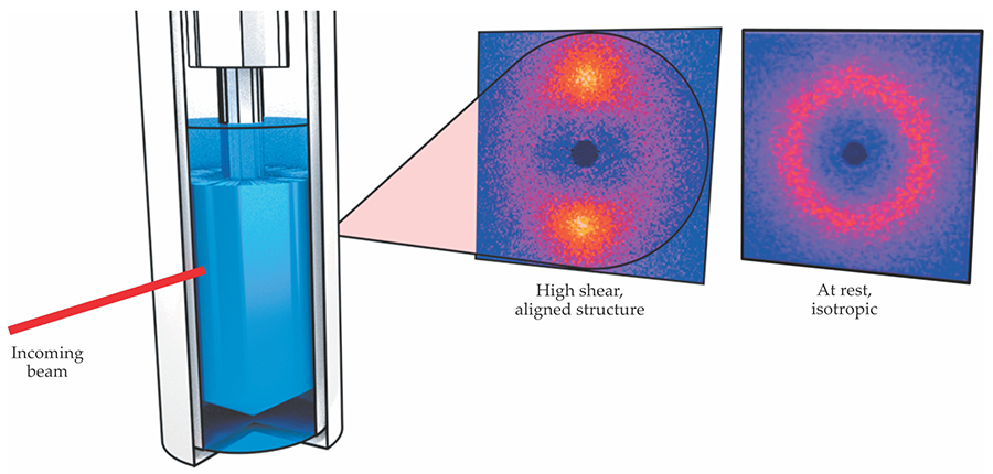 Hybrid rheo-scattering experiments involve scattering light, x rays, or neutrons from samples undergoing deformation. In the left panel, a cylindrical rotating bob immersed in a fluid sets up a shear field. Scattering provides information relating the microstructure to the rheology. In this example, the fluid includes polymer-like micelles, clusters of colloidal molecules. Shearing at high rates aligns the micelles and leads to an anisotropic scattering pattern (central panel; yellow indicates greatest scattering and blue least). In contrast, when the material is at rest, the scattering pattern is isotropic (right panel).