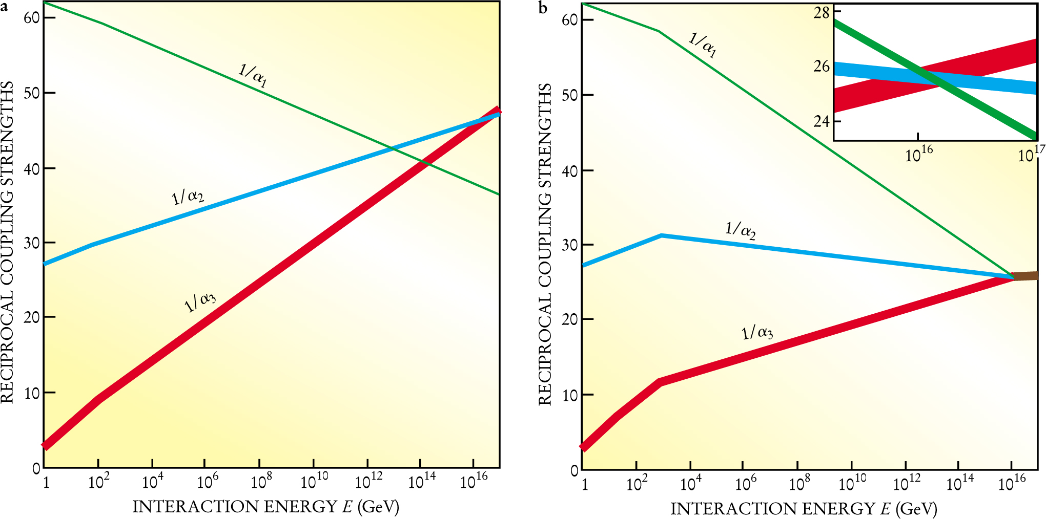 Figure 1. The three coupling “constants“ of the standard model of particle theory are, in fact, “running” functions of the energy E at which particles interact. Plotted here are the reciprocals of the running coupling constants for the electroweak interactions (α 1 and α 2) and the strong interaction (α 3), theoretically extrapolated to energies far above our experimental knowledge. The two electroweak couplings refer, respectively, to U(1) and SU(2), the two internal-symmetry groups of the theory. In the minimal standard model (a) the three couplings fail to converge. But the supersymmetric extension of the standard model (b) does succeed in uniting the extrapolated couplings to within a few percent (see insert) at about 1016 GeV. The kinks near 103 GeV, crucial to that convergence, reflect the predicted appearance of supersymmetic particles at those energies.