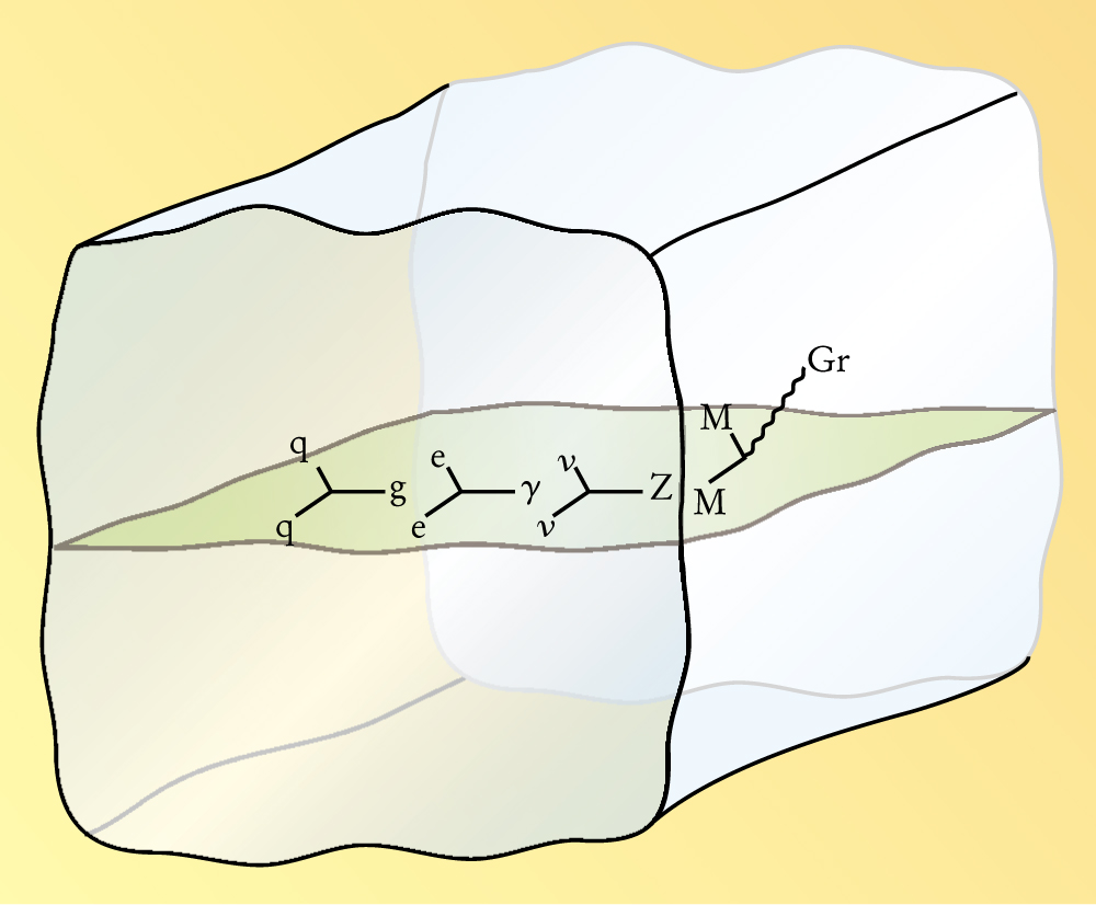Figure 2. The three spatial dimensions in which we live are perhaps just a membrane (a 3-brane) embedded in a higher-dimensional bulk. The three Feynman graphs on the 3-brane represent the confinement of the three standard-model forces and their particles (for example, quarks, gluons, electrons, photons, neutrinos, and Z0 bosons) to our familiar three-dimensional subspace. Only the graviton (Gr), the quantum of gravity, is free to radiate into the bulk.