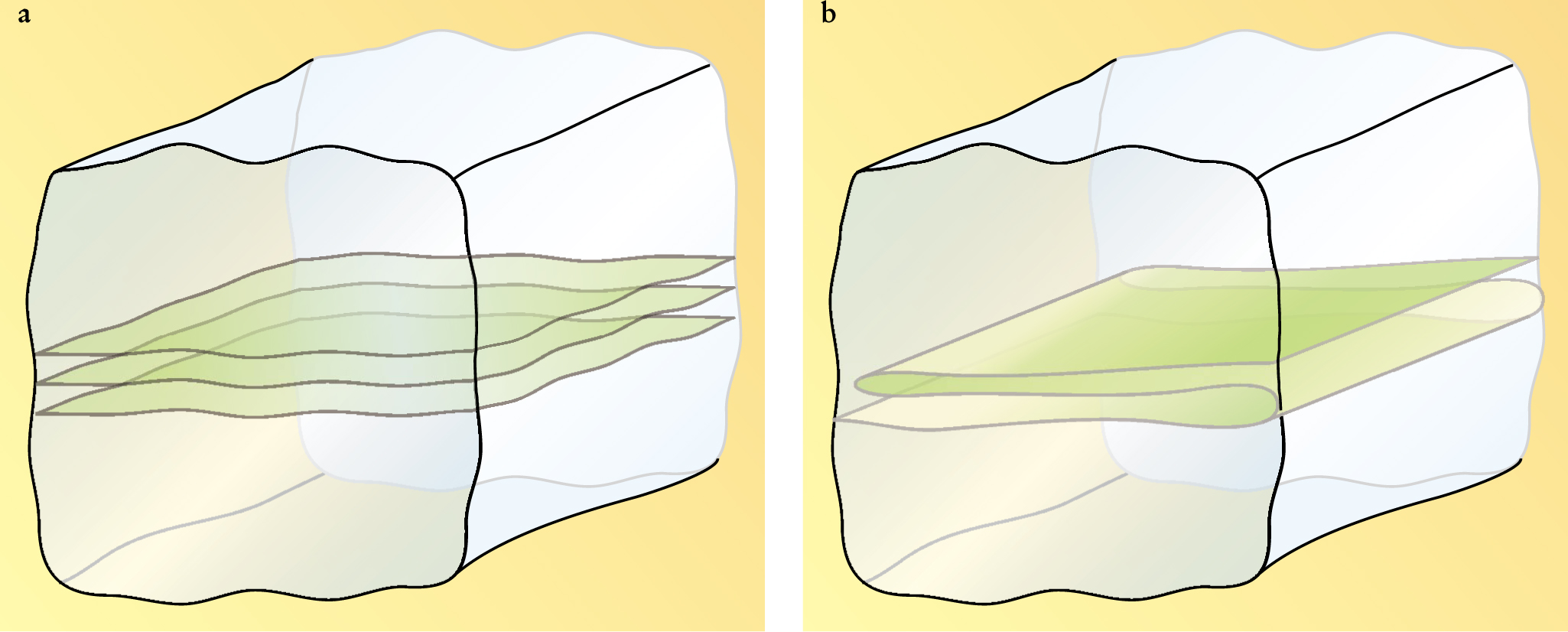 Figure 3. Inconspicuous neighboring 3-branes may be separated from us by only a fraction of a millimeter, or even much smaller distances, across the higher-dimensional bulk. They may be (a) completely separate 3-branes with their own fundamental parameters quite different from our own. Or (b) they may simply be distant folds of our own 3-brane, with the same physics, but able to influence us across shortcuts through the bulk.