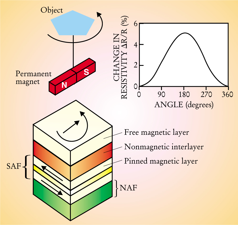 Figure 1. A layered magnetic structure used for a giant magnetoresistance-based field sensor to control rotating obects. The object (at top) is connected to a permanent magnet that rotates with it, causing a rotation in the magnetization of the free magnetic layer. The output of the sensor is the resistivity of the structure (inset graph), which, by the GMR effect, varies with the angle between the free layer magnetization and that of the pinned magnetic layer underneath. The lower layers of the structure serve to establish a directional orientation for the device: The natural antiferromagnet (NAF) on the bottom sets a preferred magnetization direction in the ferromagnetic layer just above it by exchange bias, and that layer is coupled through a nonmagnetic layer to the pinned magnetic layer above it by interlayer exchange coupling. The coupling of the latter two layers is antiferromagnetic, and the three middle layers comprise a synthetic antiferromagnet (SAF). The actual structure is much wider than it appears in the diagram. A sensor based on TMR instead of GMR would have an almost identical design, but with an insulating material in place of the metallic nonmagnetic interlayer.