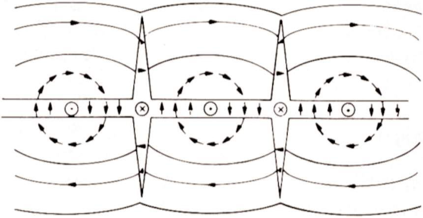 The structure of a cross-tie wall is sketched in figure 2: It may be regarded as a Néel wall having alternating intervals of oppositely directed senses of rotation of the magnetization within the wall.