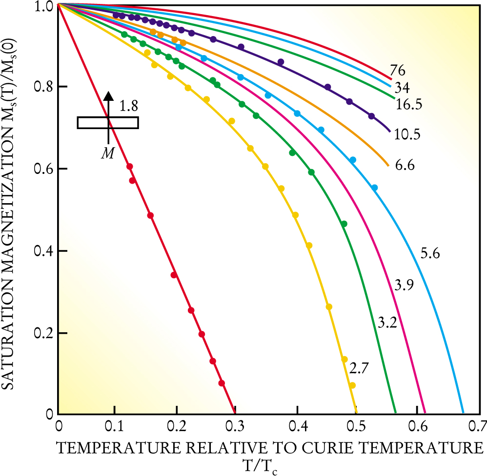 An important indicator of the transition from bulk to 2D behavior is the temperature dependence of the saturation magnetization MS(T), a readily measured quantity important for extrapolating ground-state properties from finite-temperature measurements. The dependence of the magnetization curve of a thin film of Ni 48Fe52 on film thickness is shown in figure 3; the curve becomes more linear as the film thickness is decreased, while at the same time the Curie temperature Tc decreases.