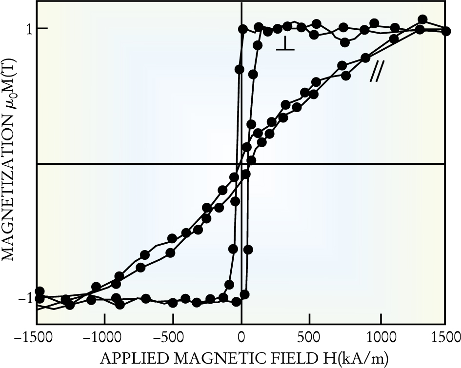 Figure 4. Strong perpendicular anisotropy is evident in the remagnetization (hysteresis) curves of the layered structure (Co1/Ni2)20, constructed using 20 repetitions of a sequence of one monolayer of Co and two monolayers of Ni. For a field H applied perpendicular to the plane, the magnetization increases and saturates rapidly, whereas for a parallel applied field the magnetization saturates only at approximately 1500 kA/m.