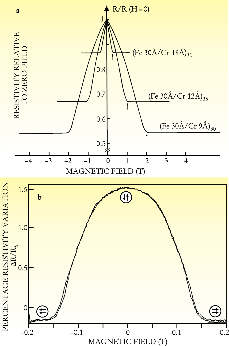 Figure 5. First observations of GMR in two different types of layered systems. The plots show changes in resistivity as a function of applied magnetic field. (a) The ratio of the measured resistivity to the zero-field resistivity for three different Fe/Cr multilayers, with structure as indicated—for example, (Fe 30 Å/Cr 12 Å)35 denotes a structure built from 35 copies of a sandwich of a 30 Å layer of Fe and a 12 Å layer of Cr. The arrows indicate the saturation magnetic field for the structure. (b) The percentage change in resistivity of a Fe/Cr/Fe trilayer from the value RS at saturation magnetic field along the easy axis. At high field magnitudes, R−RS is negative because the resistivity is further lowered by anisotropic magnetoresistance. The circled arrows indicate the directions of the magnetization in the Fe layers.