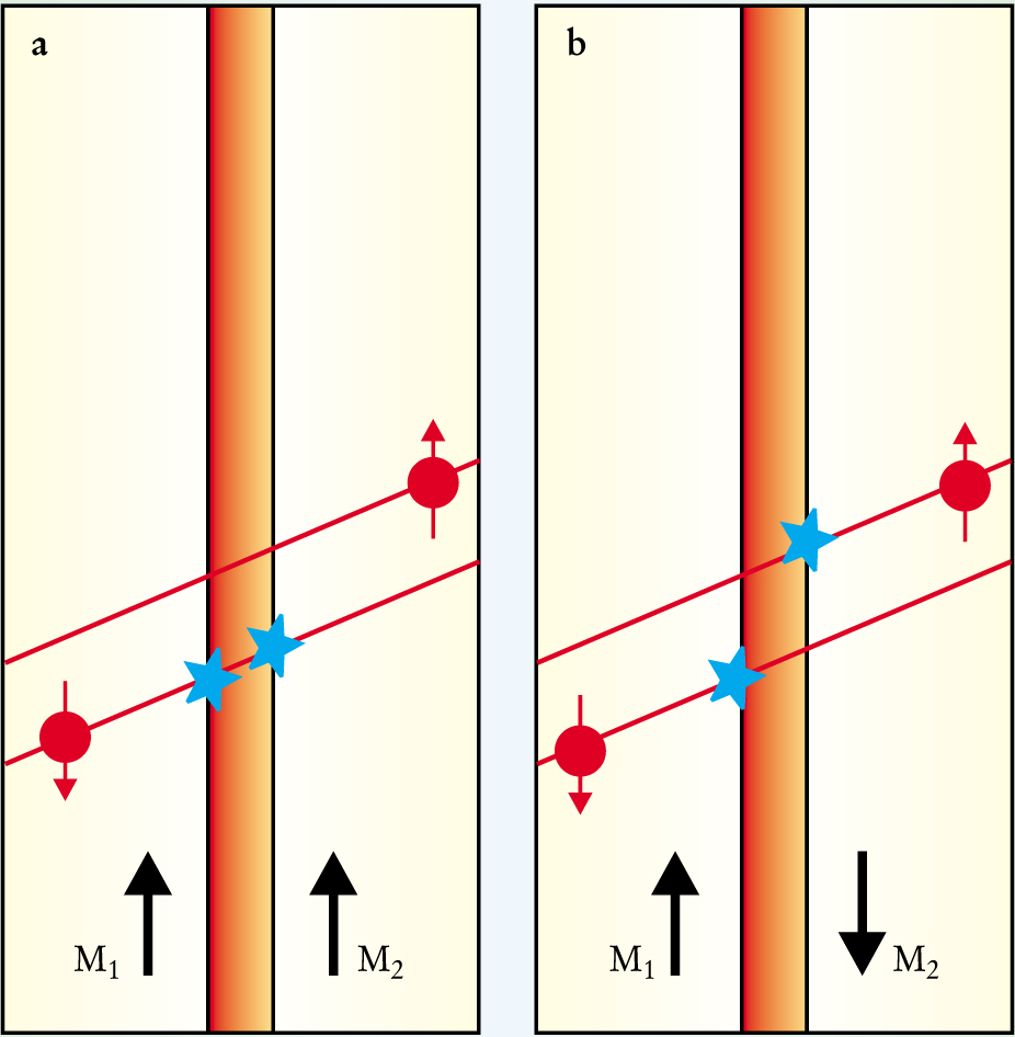 Figure 6. Spin-dependent scattering is believed to underlie the variation of conductivity with the relative orientation of magnetizations in coupled layers. Cross sections of a stucture of two ferromagnetic films (yellow) are shown, having magnetizations M1 and M2 in the directions indicated by arrows, and separated by a nonferromagnetic interlayer (orange). The net current flow is from bottom to top, but the conduction electrons (red dots with an arrow denoting the spin orientation) drift randomly within and between the layers. For simplicity, it is assumed that only electrons with their spins antiparallel to the local magnetization are scattered. (a) With parallel M1 and M2, spin-down electrons are scattered while spin-up electrons flow freely in a “short circuit.” (b) With antiparallel M1 and M2, both spin-down and spin-up electrons are scattered.
