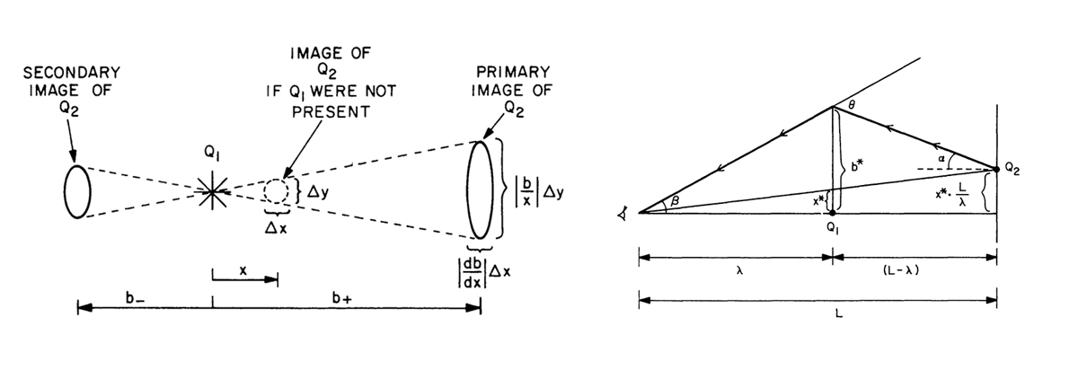 Early arguments for the existence of gravitational lenses relied heavily on geometric schemata based on simple optics models, such as these images from a 1974 paper by J. Richard Gott III and James Gunn. (Images from ref.
