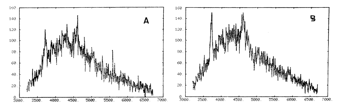 Two quasar spectra taken by Robert Carswell and Dennis Walsh on 29 March 1979, which they later identified as evidence of a gravitational lens. The first spectrum is on the left; the second, at right, was taken just a few moments later. (Images from ref.