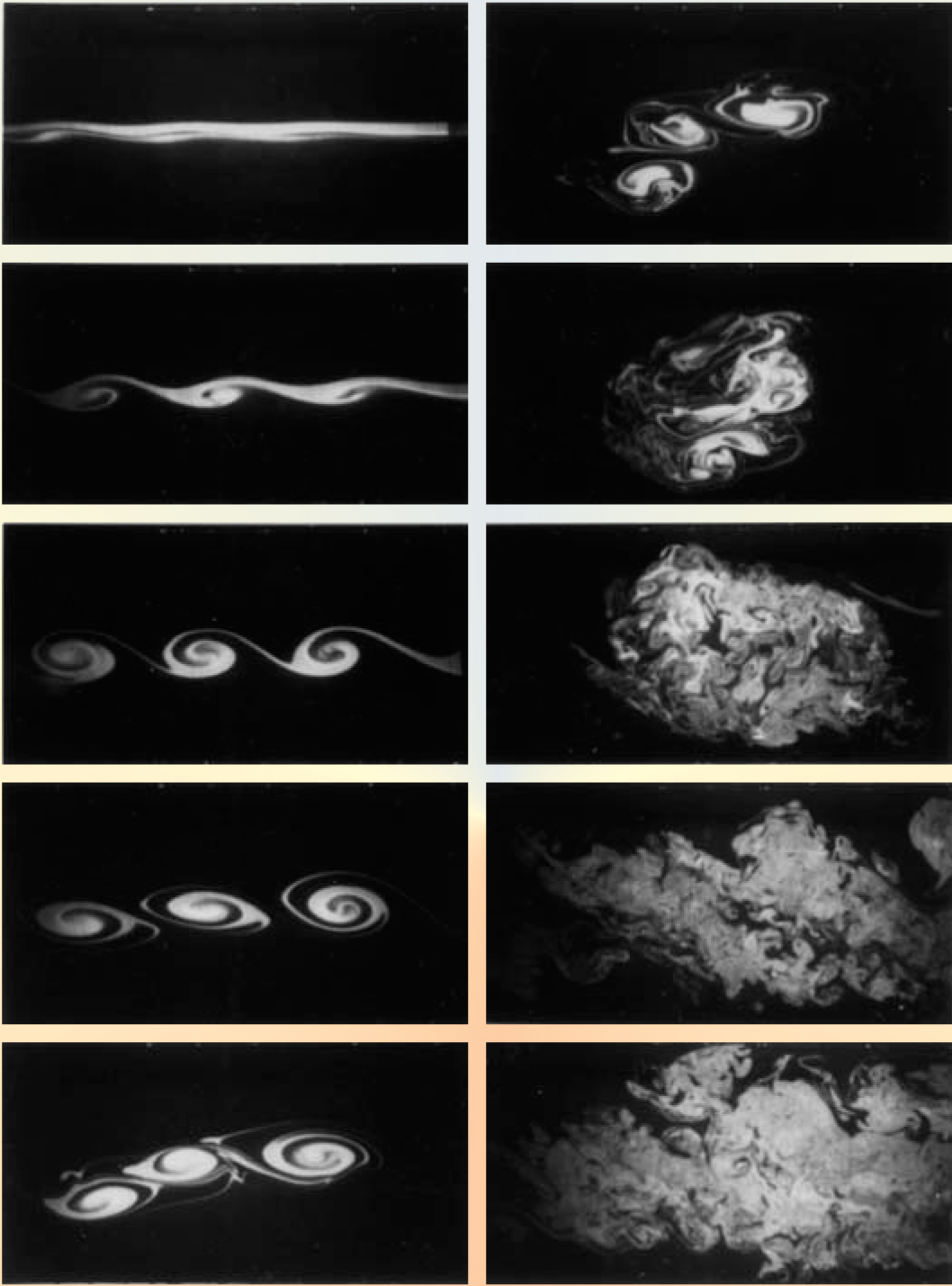 Figure 1. The transition to turbulence is visible in this series of photographs for which time increases from top to bottom, left to right. This particular process shows the initiation of the Kelvin–Helmholtz instability in a shear flow, which is by no means the only way to generate turbulence. The bright region marked by dye is sheared by opposing uniform streams of fluid, which appear dark in the photos. The dyed region becomes increasingly wavy, then, due to nonlinearities, rolls up into distinct vortices that merge with neighbors and eventually become turbulent. Although we understand well the first few steps in the evolution, we still only poorly understand how the turbulence is generated.