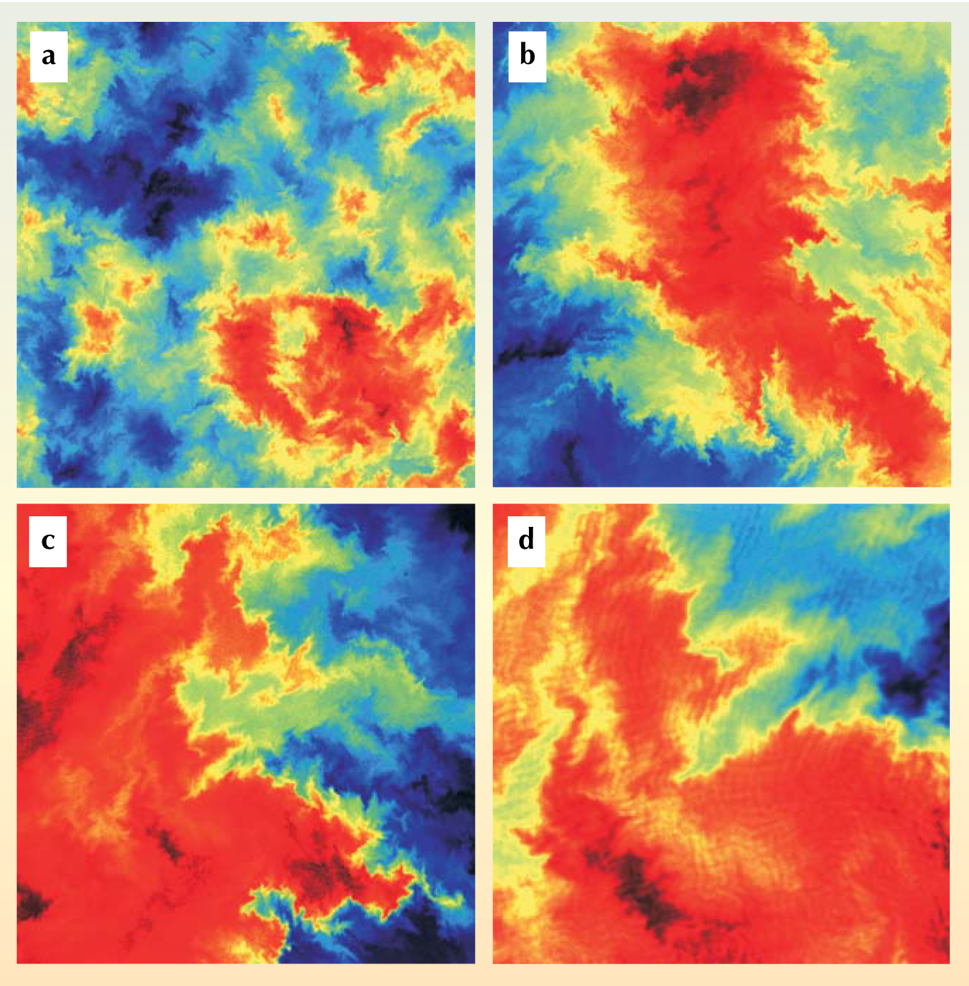Figure 5. Scale invariance is manifested in this sequence of snapshots of a two-dimensional passive scalar field evolved in a particular type of Kraichnan model. The colors indicate the value of the field, red being high and blue low. The four panels in the sequence a–d show increasingly magnified views of a fixed location at a specific time. Clearly the four images are not identical. But they are similar in a statistical sense, and that notion of statistical self-similarity can be made quantitative.18