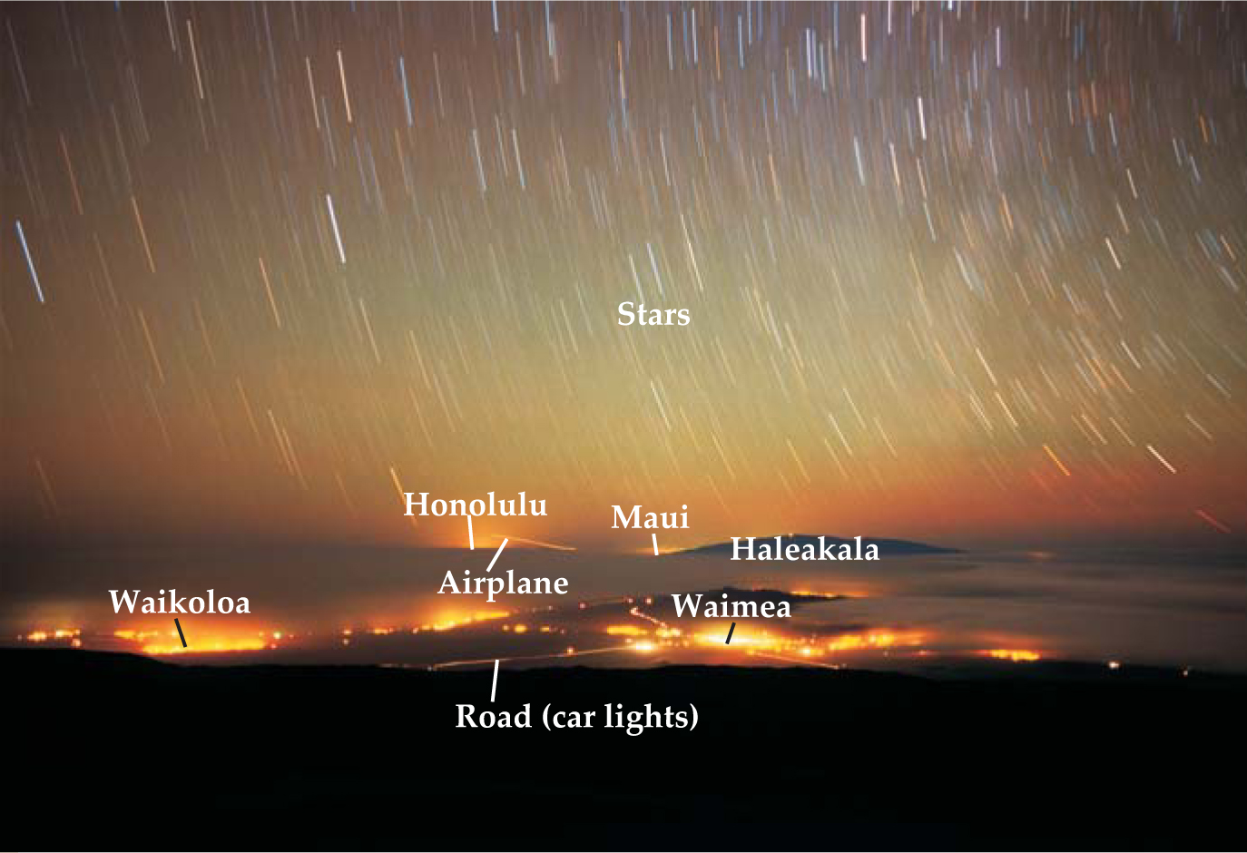 Figure 1. The sky over Mauna Kea, Hawaii, is affected by outdoor lighting in communities from Waimea 30 km away to Honolulu 300 km away.