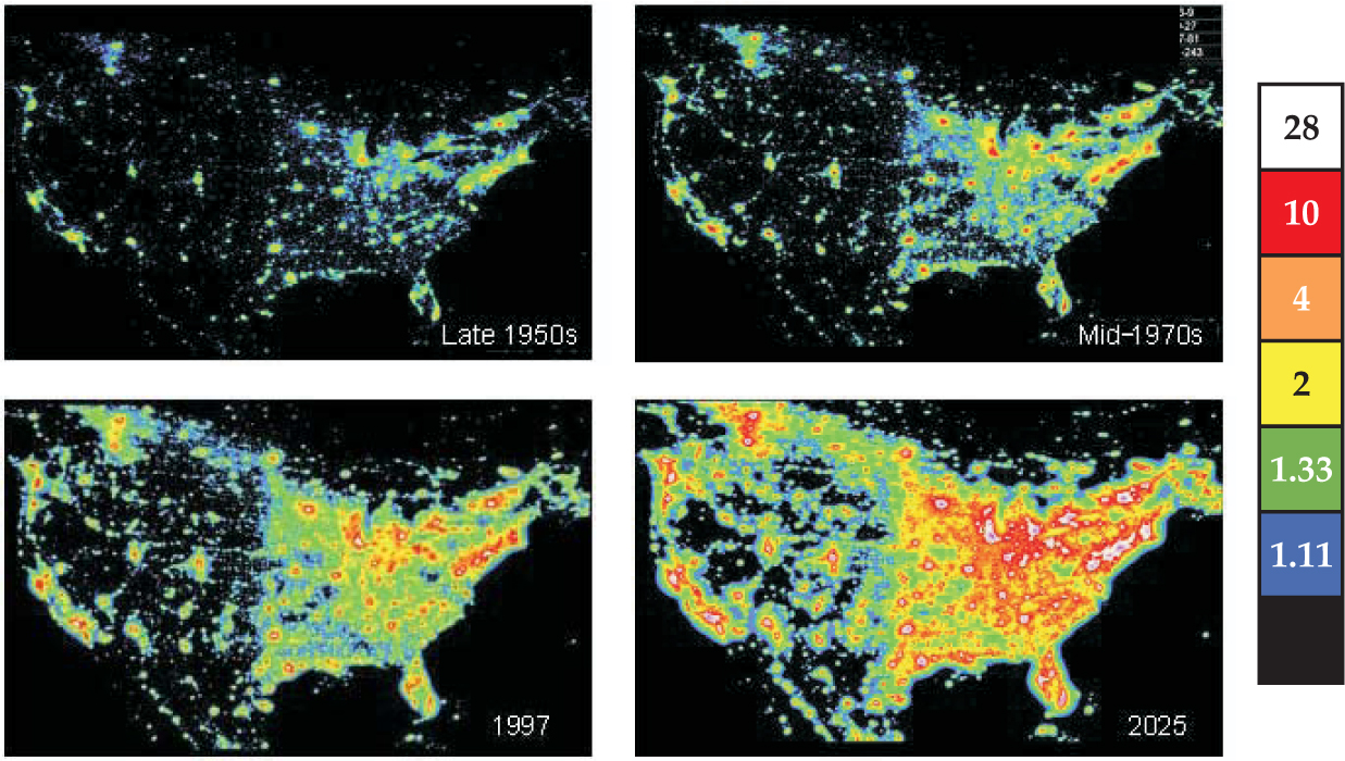 Figure 2. Sky glow over time is estimated by extrapolating 1997 satellite measurements forward and backward using a 6% annual growth rate. That average rate, determined from ground-based measurements of sky brightness, is applied equally to all points; no attempt has been made to model actual growth rates for different regions. The scale shows the brightness normalized by the natural condition; for example, the boundary between blue and green is 33% brighter than the natural sky.