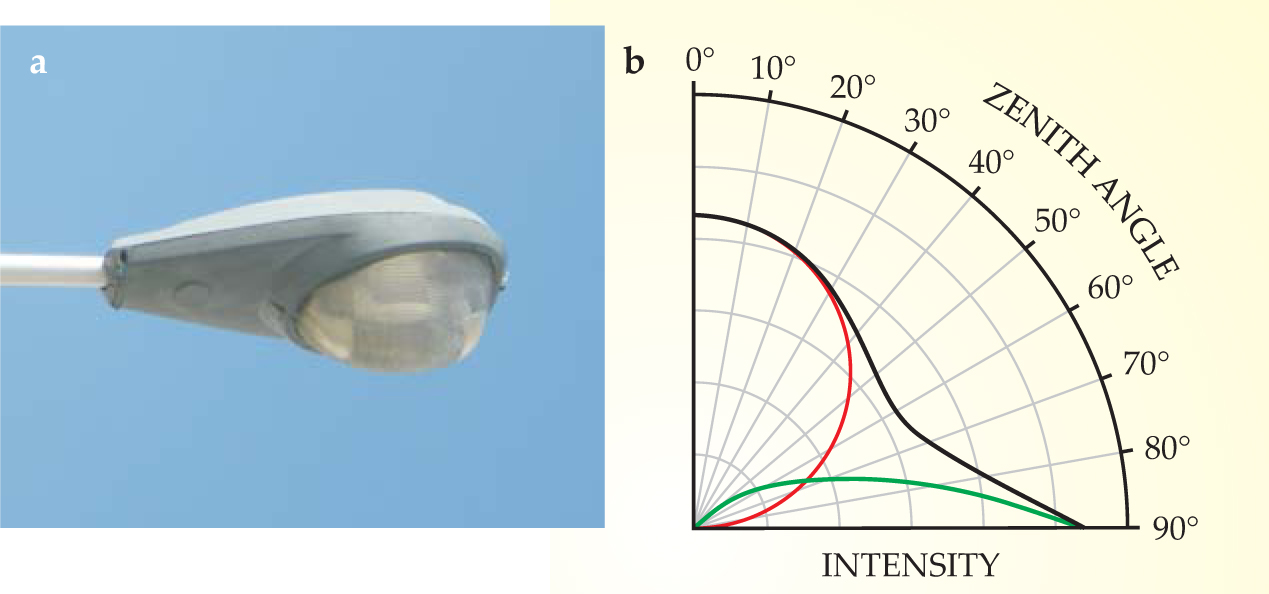 Figure 3. (a) A typical light fixture that allows some emission above the horizontal. (b) The angular intensity distribution used by Roy Garstang to represent light propagating upward into the sky. The green line represents light emitted directly from fixtures such as the one in panel a, the red line represents light emitted downward and reflected off the ground, and the black line is the sum of the two.