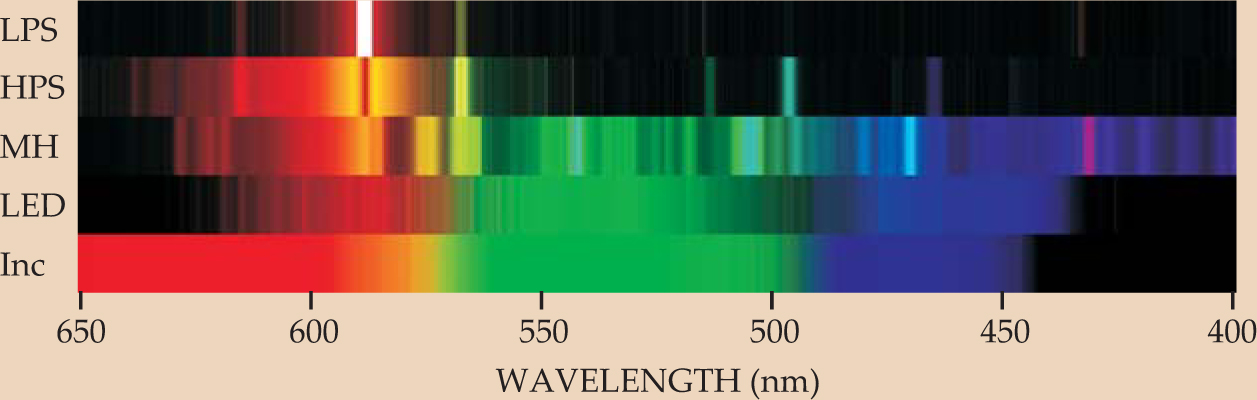 For decades astronomers have naturally favored lighting sources that confine emissions to as narrow a portion of the spectrum as possible. Low-pressure sodium lights are particularly preferred, 6 because most of their emission is in the sodium resonance doublet near 589 nm, as shown in figure 5. Indeed, they are widely used in several regions near major astronomical observatories. High-pressure sodium lamps are second best: They emit mostly in the yellow portion of the spectrum, but through pressure broadening and the inclusion of other compounds in the discharge arc they produce some light in the red and the blue.