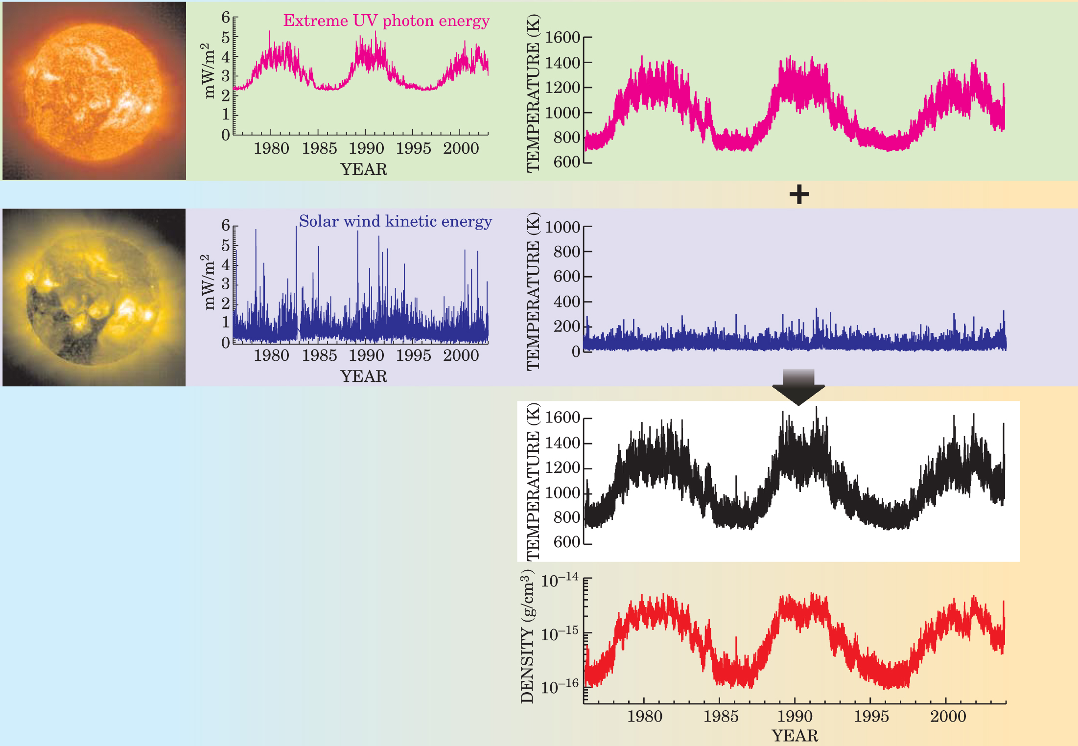 Figure 4. Fluctuations in Earth’s upper atmosphere at 500 km over Boulder, Colorado, at noon, as estimated by a semiempirical model.9 Energy from extreme UV photons produced principally in the bright areas of the Sun’s chromosphere and corona (top left) heats Earth’s upper atmosphere to approximately 750 K. Variations in the solar EUV irradiance (top middle) can increase the temperature by more than 500 K during high solar activity (top right). Solar wind particles and plasma that emerge from the Sun’s outer atmosphere, such as through dark coronal holes (bottom left), disrupt Earth’s magnetic environment and produce additional daily mean temperature fluctuations up to 100 K (blue trace on right). The net changes in Earth’s atmospheric temperature at 500 km (black trace) are accompanied by variations in total mass density (red trace). Among the effects of the density changes are fluctuations in the drag on spacecraft (including the International Space Station at 400 km) in low-Earth orbit. Solar activity also alters the ionosphere and affects radio-wave propagation.