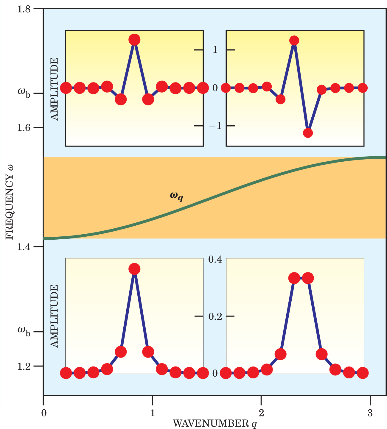 Figure 1. The frequency versus wavenumber plane shows the spectrum of linear oscillations ωq=2+(2/Δx)2sin2(q/2) (green) for Δx = √10 and two isolated frequencies ωb from the range of possible frequencies corresponding to the types of ILMs—four of which are shown—that exist in the equation on page 43. The middle area (gold) exhibits the full spectrum of linear excitations which extends from √2 to about 1.55 for this Δx. The ILM frequencies ωb clearly lie outside the linear band. Red circles indicate the particle displacements for the given ILM solution, with all velocities equal to zero. The scale inset between panels indicates amplitudes of the motion, and blue lines are guides for the eye. The high-frequency ILMs (ωb ≈ 1.66) occur for large amplitude, high-energy motion of optical phonon character (adjacent particles moving out of phase), whereas the low-frequency ILMs ωb ≈ 1.26) occur for small amplitude, low-energy motion of acoustic phonon character (adjacent particles moving in phase).