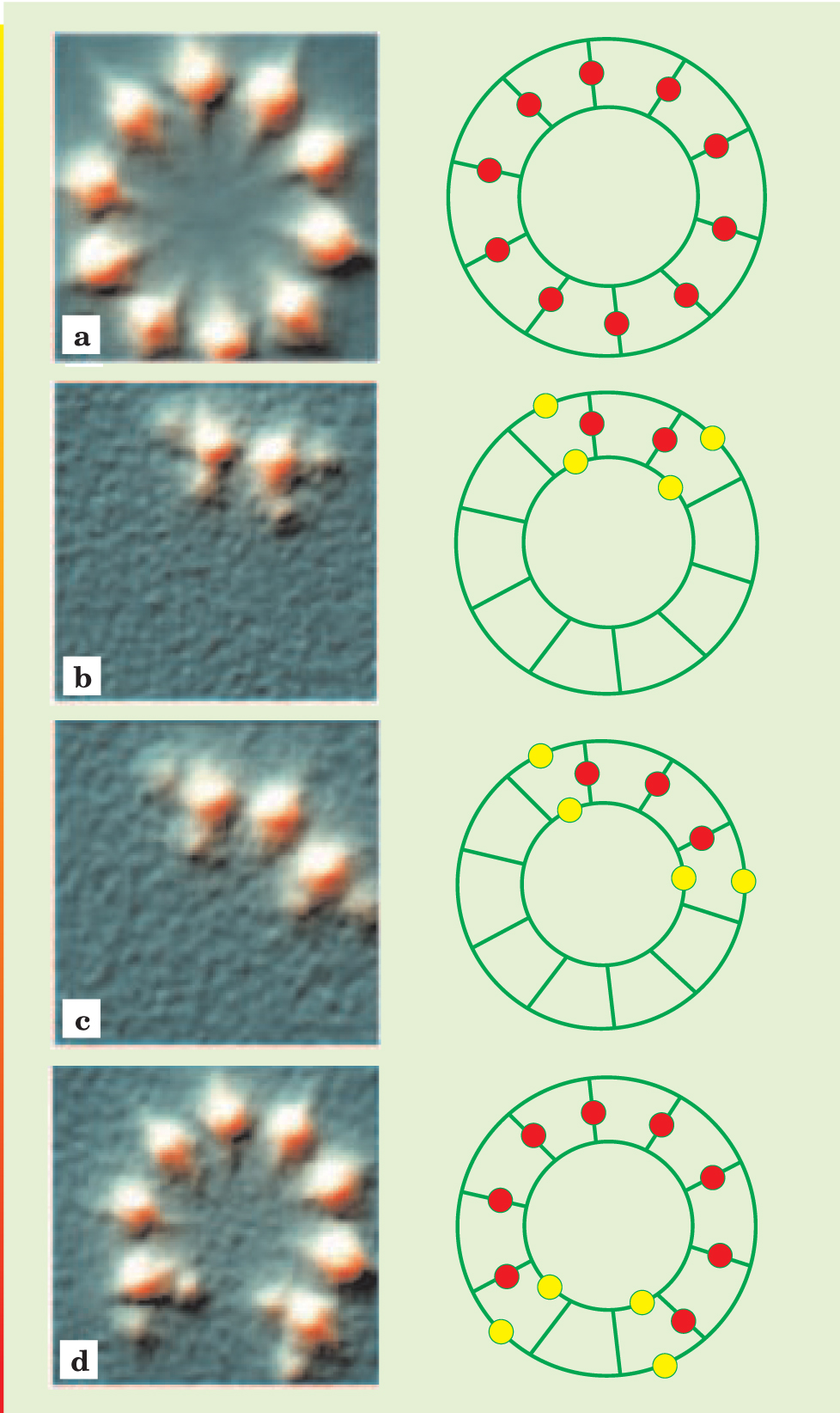 Experimental and schematic images of intrinsic localized modes in an annular Josephson ladder driven by a DC current. In the schematics, Josephson junctions (each about 3 µm wide) lie at the midpoints of each green line segment that signifies superconducting leads connecting the junctions. A pure green ladder in the schematic and a pure green background in the data would signal the superconducting state of all junctions at low DC current—the linear regime. But a large DC current switches some of the junctions into a resistive state that supports a voltage across the junction; in the schematic, red and yellow dots denote resistive junctions having different voltages. These resistive junctions are discrete breather excitations localized at various sites on the ladder, here imaged using a scanning laser microscope. Among the many possible DB states, these data show four: (a) a highly excited, spatially homogeneous resistive state and (b–d) localized states corresponding to several distinct DBs.