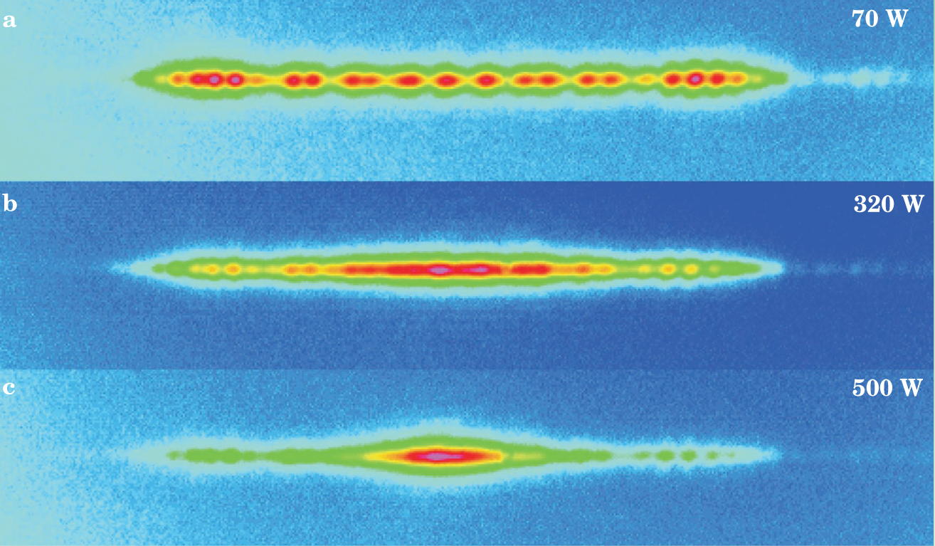 An intrinsic localized mode (ILM) emerges in the output of an optical planar waveguide array (shown on edge) as the power from input laser light increases into the strongly nonlinear regime. Each waveguide of the array extends out of the page, with the laser input (from behind the page) focused near the center. (a) For a laser power of 70 W, linear propagation occurs and the excitation of modes diffracts over the entire array. (b) At intermediate power (320 W), the output pulse narrows, showing increased localization effects. (c) At high power (500 W), the nonlinear nature of the optical medium localizes the output in an ILM located around the input waveguide.