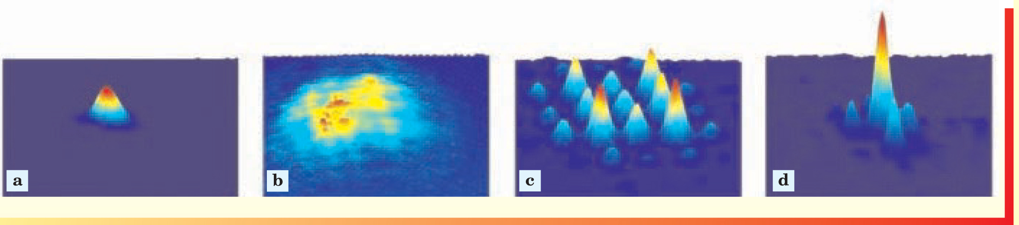 The optical analog of semiconductors, these artificial crystalline structures provide novel and unique ways of controlling many aspects of electromagnetic radiation, including the exciting possibility of light-induced radiation control—that is, the use of light to switch and channel light. Two years ago, Sergei Mingaleev (now at the University of Karlsruhe) and one of us (Kivshar) predicted the nature of the ILMs that could occur in a composite photonic crystal formed by a regular 2D lattice of rods of two different types of semiconductors. That work awaits experimental confirmation. However, experimental groups led by Mordechai Segev (Technion) and Zhigang Chen (San Francisco State University) have recently used optical induction in a homogeneous nonlinear medium to confirm the existence of this type of ILM in an analog of a 2D nonlinear photonic crystal. Segev’s group used a photorefractive crystal with a strong electro-optic anisotropy to create a lattice with a polarization in the nonelectro-optic direction and orthogonal to that of a probe beam. They observed the light localization in the form of 2D discrete solitons. Similarly, Chen’s group used a nonlinear lattice, created by partially incoherent light, to observe strong localization in the regime of large nonlinearities (see figure 4). Both sets of results illustrate the tremendous promise for optically excited and controllable nonlinear localized states as elements of future all-optical logic and switching devices.