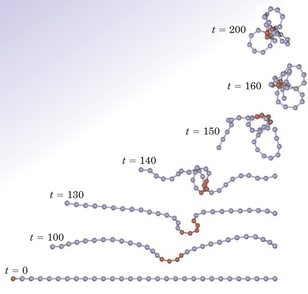 A biopolymer chain buckles and folds in on itself due to an instability produced by a moving nonlinear localized mode. That mode started as a single-particle excitation at the left end of the 30-particle chain and propagated to the middle. Marked particles indicate the location of the moving ILM excitation as a function of the time t (in dimensionless units).