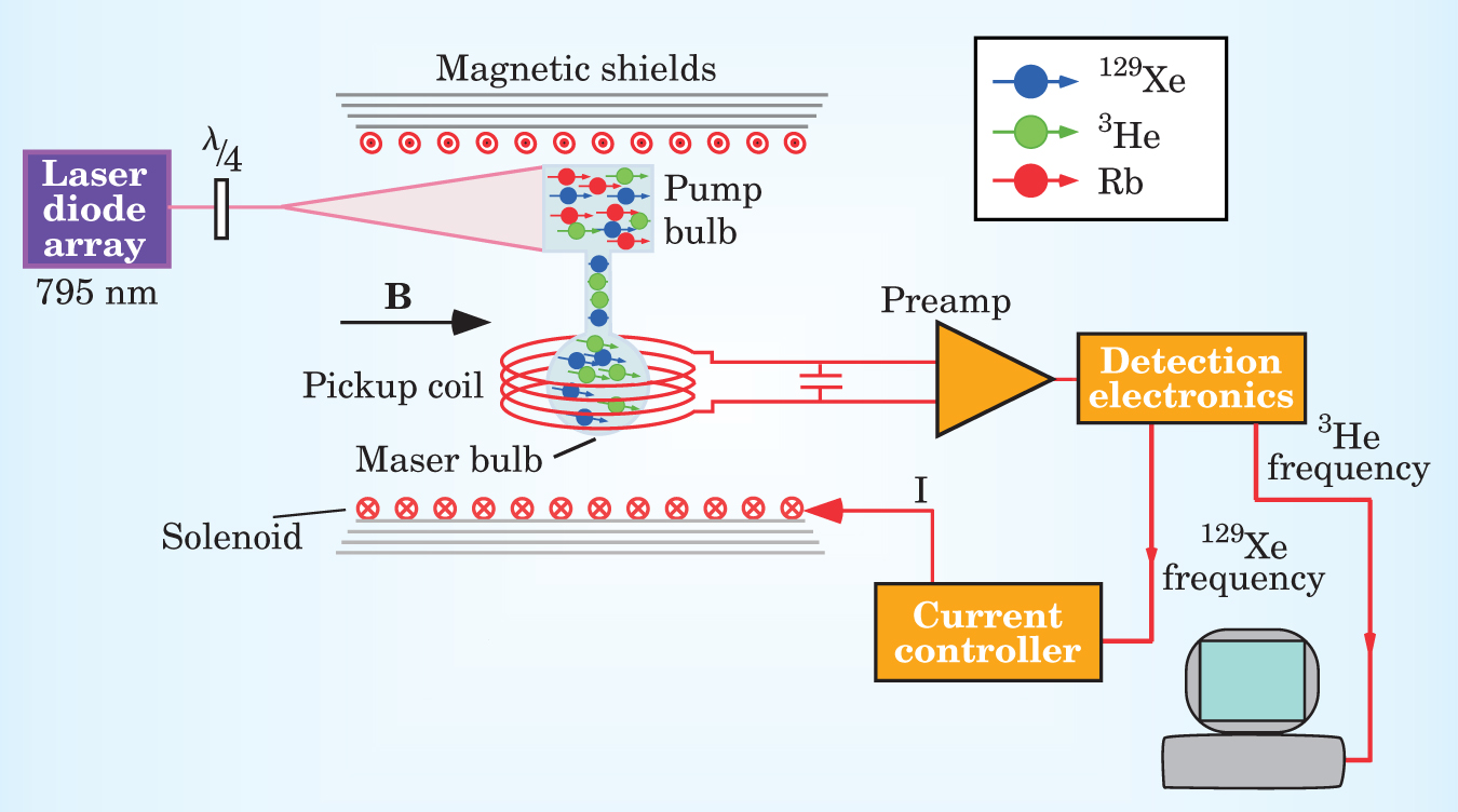 Figure 2. A spin maser experiment with helium-3 and xenon-129 atoms sets the best limit on Lorentz-violating effects for the neutron. A double-bulb glass cell contains 3He and 129Xe atoms in both chambers and additional rubidium atoms in the upper bulb. An optical pumping laser array spin-polarizes the Rb atoms, which transfer their polarization to the 3He and 129Xe via spin-exchange collisions. The lower bulb is located inside a pickup coil connected to an external resonator with resonances at the Zeeman frequencies for both 3He and 129Xe. Resonance currents in the pickup coil maintain a persistent precessing magnetization of both spin species while the current controller adjusts the magnetic field to maintain a constant spin-precession frequency for the 129Xe. Any change in the 3He spin-precession frequency thus indicates a Lorentz-violating spin interaction.