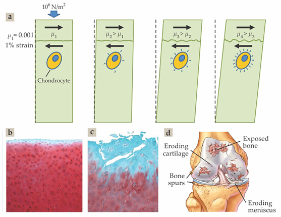 That undesirable effect makes the chondrocytes especially vulnerable to high friction. It also provides a direct link between the health of the cartilage and the level of lubrication at its surface. The low friction of healthy cartilage ensures that there is little shear stress at its surface during articulation. However, if the friction increases unduly—due to a traumatic event, such as a sporting accident, or with age—the higher shear stress at the cartilage surface leads to higher shear strain on the chondrocytes embedded in it. That strain in turn leads in a self-reinforcing manner to overall wear of the tissue and eventually osteoarthritis, as illustrated in figure