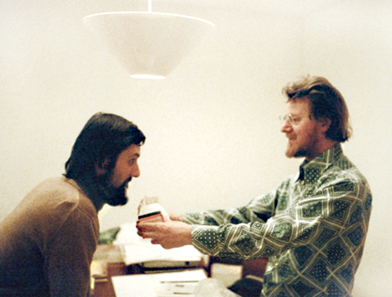 I well remember one of our afternoon rituals. John, a true Irishman, always had to drink tea at four o’clock; figure 1 shows us checking out a sample at his home. We also practiced our ritual in the CERN cafeteria, where John always ordered deux infusions verveine, s’il vous plaît—two infusions of verbena, his favorite tea, for us to enjoy together. There, in a relaxed atmosphere, we talked about physics and philosophy. At times we were joined by my artist wife, Renate, and then the three of us had heated debates about modern art.