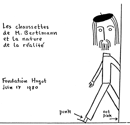Figure 2. My socks were always of two different colors, as John Bell observed in this cartoon accompanying his paper “Bertlmann’s socks and the nature of reality.”8,10 The paper, which addressed the difference between quantum and classical correlations, was based on a colloquium, “Conceptual Implications of Quantum Mechanics,” organized by the Hugot Foundation of the Collège de France.