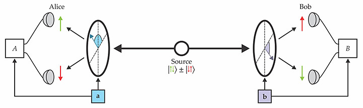 Figure 3. John Bell’s famous inequality was derived for the setup illustrated here. A pair of spin-½ particles are prepared in a state of zero angular momentum, and each propagates freely in opposite directions to the measuring stations called Alice and Bob. Alice measures the spin in a direction a while Bob simultaneously measures in a direction b. In a hidden-variable theory, the measurement results are predetermined; the hidden variables might decree, for example, that if Alice measures her spin up, Bob will measure his down. (Adapted from R. A. Bertlmann, J. Phys. A47, 424007, 2014.)
