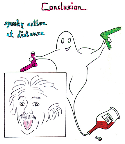 that I dedicated to him in 1988 on the occasion of his 60th birthday. I sketched my conclusion in a cartoon, shown as figure 4. John, who strictly avoided alcohol, was very much amused by my illustration, since the spooky, nonlocal ghost emerged from a bottle of Bell’s whisky, a brand that really did exist.