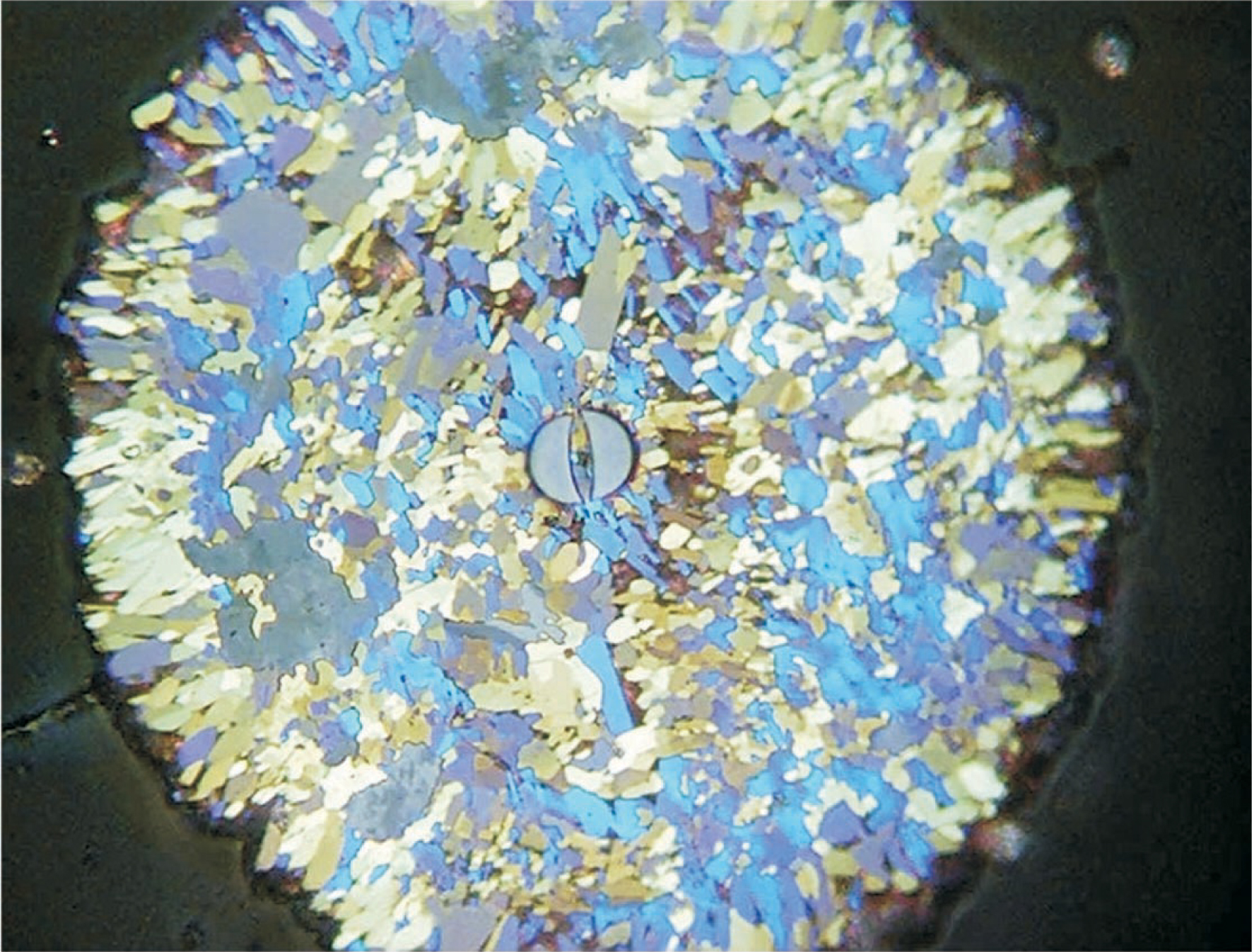 Figure 1. Magnesium diboride was discovered in 2001 to become superconducting below about 40 K, a remarkably high transition temperature for an intermetallic compound. This image from an optical microscope shows a cross section of a MgB2 wire, about 150 µm in diameter, composed of fine grains with a wide distribution of orientations.