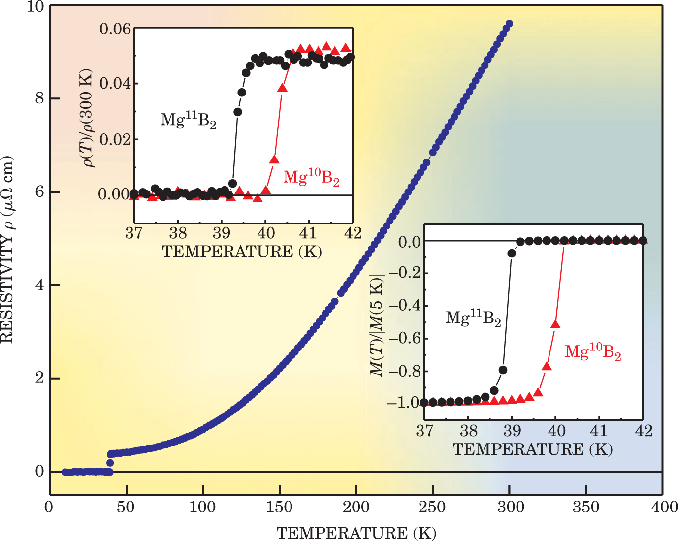 Figure 2. Magnesium diboride’s superconducting transition below about 40 K is clearly seen in the temperature dependence of the electrical resistivity ρ. The insets show the effect of replacing boron-10 with boron-11: a reduction of about 1 K in the transition temperature. The isotope effect is seen in transport properties, such as normalized temperature-dependent resistivity in the top left plot, and in bulk thermodynamic properties, such as the normalized magnetization M plotted in the lower right.