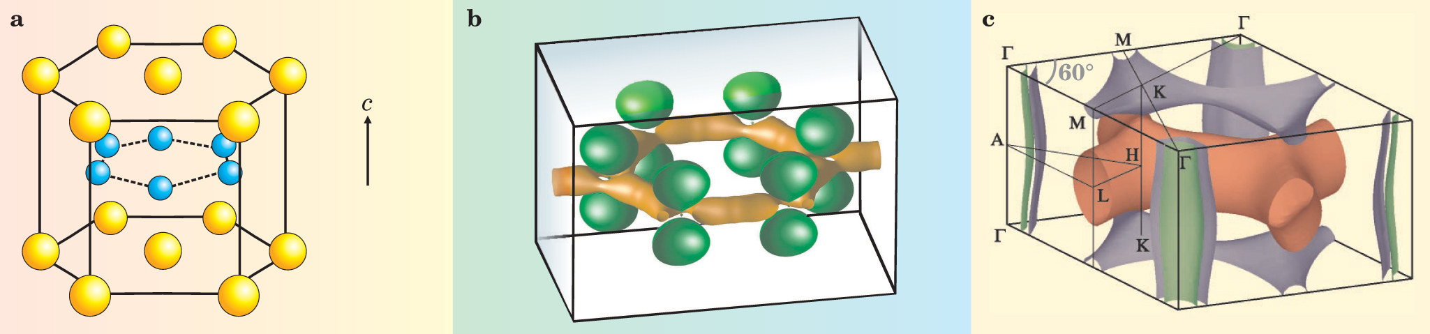 Figure 3. Structure of magnesium diboride. (a) The crystal structure of MgB2 features hexagonal planes of magnesium (yellow) interleaved with honeycomb layers of boron (blue). (b) The boron atoms form a two-dimensional network of σ bonds and a three-dimensional network of π bonds; the two networks yield corresponding bands of electronic states. Shown here is a contour of constant charge density. The golden hexagonal network is associated with the σ bands, whereas the six pairs of green lobes above and below the boron plane are associated with the π bands. The π-band charge density extends in both the parallel and perpendicular directions to form 3D conduction states. (c) The Fermi surface of MgB2. The vertical sections of cylinders at the corners are associated with the σ bands; the more 3D network of tunnels and caves in the center of the zone is associated with the π bands. The letters designate the symmetry points of the hexagonal Brillouin zone in momentum space.