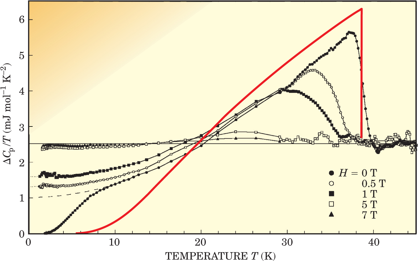 Figure 5. The electronic contribution to the specific heat Cp presented the first indication of the presence of two superconducting gaps in MgB2. The data plotted here were taken on a polycrystalline sample of MgB2 and have been adjusted to remove the lattice contribution.13 The red curve shows the prediction from the Bardeen-Cooper-Schrieffer theory for a single superconducting gap in zero magnetic field. The shoulder at low temperatures and fields indicates the existence of a second gap.
