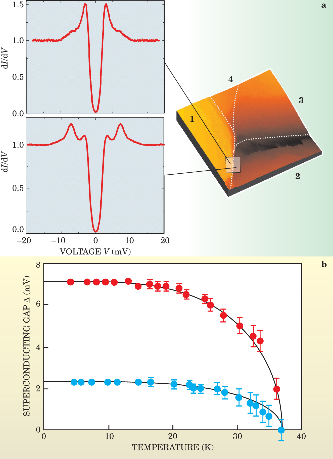 Figure 6. Tunneling experiments clearly show the presence of two superconducting gaps in magnesium diboride. (a) This topographic image (right) taken by a scanning tunneling microscope shows a section of a polycrystalline sample, 150 nm on a side, containing four grains. Tunneling spectra (left) measured with an STM change dramatically at the boundary between grains 1 and 2. The spectra are plotted as the differential conductance dI/dV (where I is the tunneling current), normalized to the high-voltage conductance. Peaks in the spectra identify the superconducting gaps. (b) The sensitivity of the spectra to the tunneling direction allows the two gaps to be distinguished and followed as a function of temperature. The red points are the large gap of the two-dimensional π band; the blue are the small gap of the three-dimensional π band.