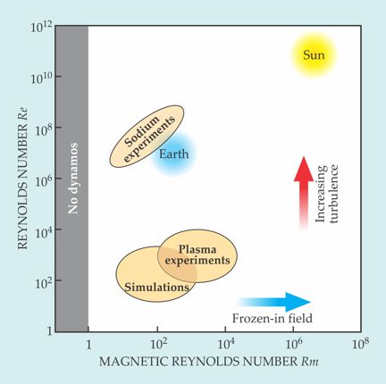 Figure 1. Magnetic dynamos with fluid conductors are characterized by two dimensionless parameters described in the text: the Reynolds number Re, which determines the turbulence of the fluid flow, and its magnetic analogue Rm. The figure shows regions of parameter space covered by familiar natural dynamos and regions accessible to computer simulations and laboratory experiments. With present-day computing power, simulations are difficult unless the two parameters are of the same order and neither one exceeds 103. Liquid-sodium experiments are useful for modeling planetary dynamos, but plasma experiments will probe much higher Rm. Theory precludes dynamo self-generation for Rm less than 1.