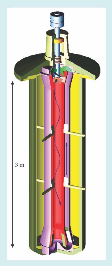 Figure 2. A pioneering experiment at the University of Latvia in Riga was one of two9,10 that demonstrated dynamo self-generation in 2000 with liquid sodium constrained to execute helical flow. In the Riga device, shown here, a propeller and baffles made the sodium spiral downward in the vessel’s central column (red) and then return straight upward in the cylindrical region (pink). The flow regions were surrounded by initially nonflowing liquid sodium (yellow). The constrained helical motion of the conducting fluid was a key component driving the dynamo. Turbulence was suppressed by the tightly constrained flow geometry. (Drawing courtesy of A. Gailitis.)