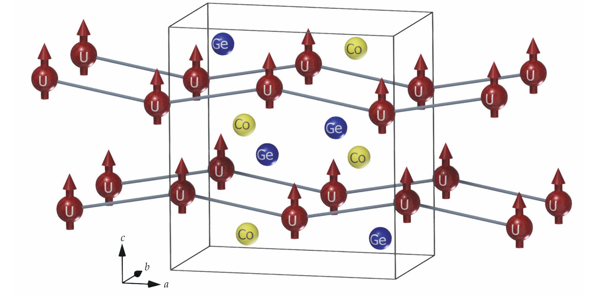 A second special feature of the materials lies in their orthorhombic crystal structure. In UCoGe, shown in figure 1, the U atoms form zigzag chains and their magnetic moments point in the same direction. Such magnetic order is called uniaxial. And its reduced dimensionality supports a special type of fluctuation in the magnetic moments along the moment direction, which favors superconductivity.