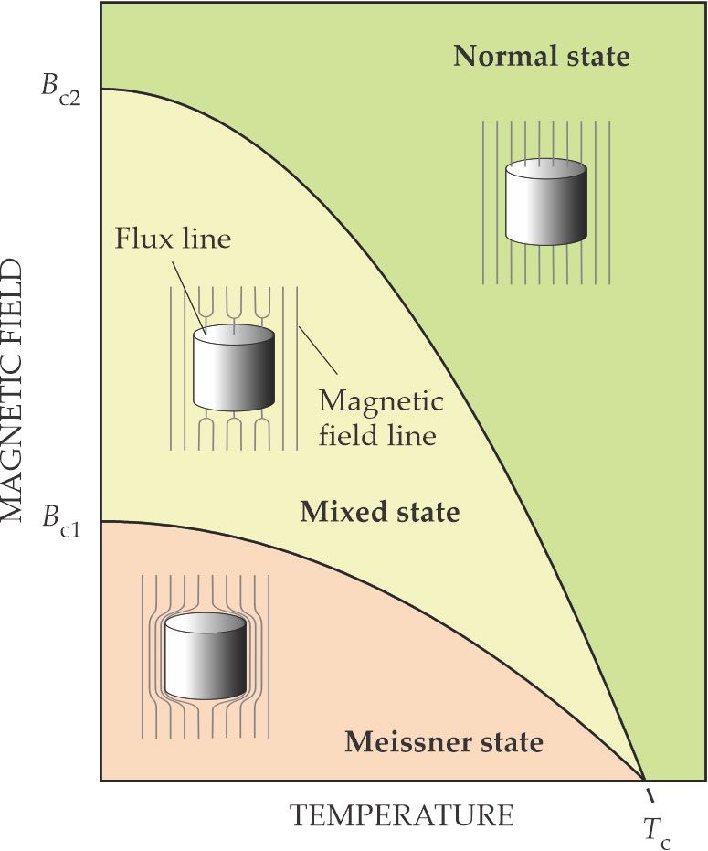 The phase diagram of a conventional BCS superconductor. In the Meissner phase, the magnetic field is expelled from the material’s interior. In the mixed (or vortex) phase, the magnetic flux penetrates the material in the form of quantized vortices. In the normal phase, the magnetic field passes through the material uniformly. The fields and are known as the lower critical field and the upper critical field, respectively, and refers to the superconductivity critical temperature. (Figure by Anne de Visser.)