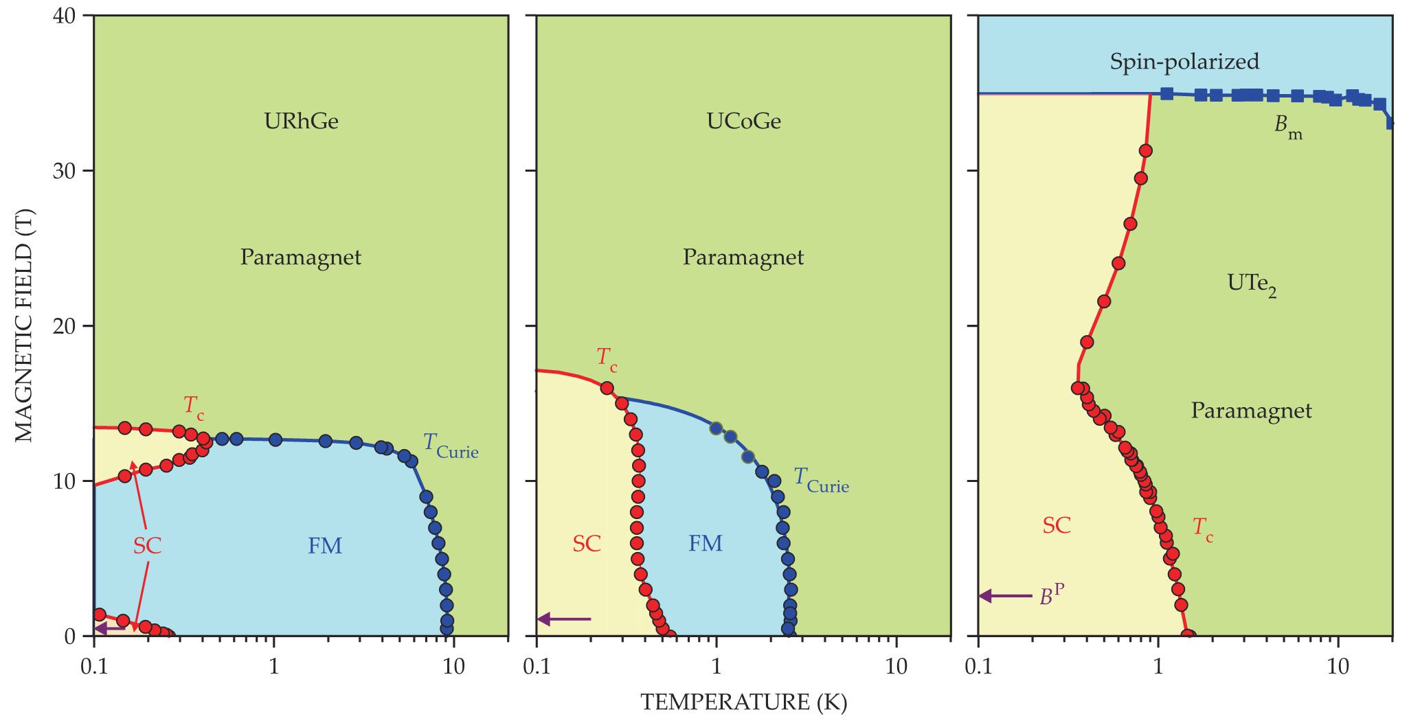 That proximity shows that those uranium-based alloys are close to a magnetic instability, a so-called quantum critical point on the phase diagram where becomes 0 K. In the vicinity of such a critical point, quantum fluctuations of the order parameter—here, the magnetic moment—control the ground state. The band nature of the ferromagnetic order plays a pivotal role in triggering superconductivity. The energy bands at the Fermi level constitute the conduction bands that are involved in the superconducting state. Hence the same electrons that bring about ferromagnetism also produce superconductivity.