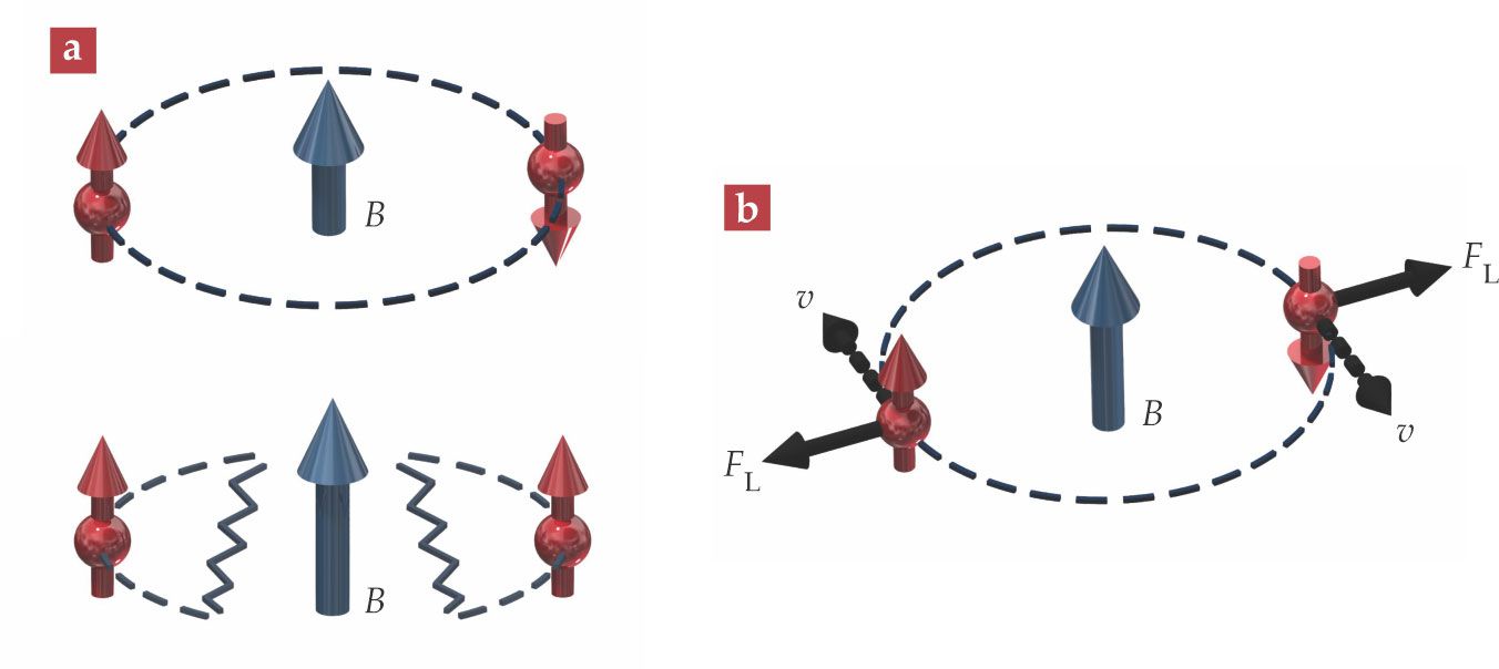 Cooper pair breaking, illustrated.(a) In a small magnetic field , the spins of the two electrons (red) in the Cooper pair are antiparallel (top). But in a large magnetic field, the electron spins will align due to the Zeeman effect and the pair breaks apart (bottom), a phenomenon known as spin pair breaking. (b) In orbital pair breaking, an applied magnetic field produces a Lorentz force on two electrons with opposite momentum and velocity ±v. When the magnetic field increases, the oppositely directed Lorentz forces eventually exceed the binding force of the electrons and the Cooper pair breaks. (Figure by Udo van Hes.)