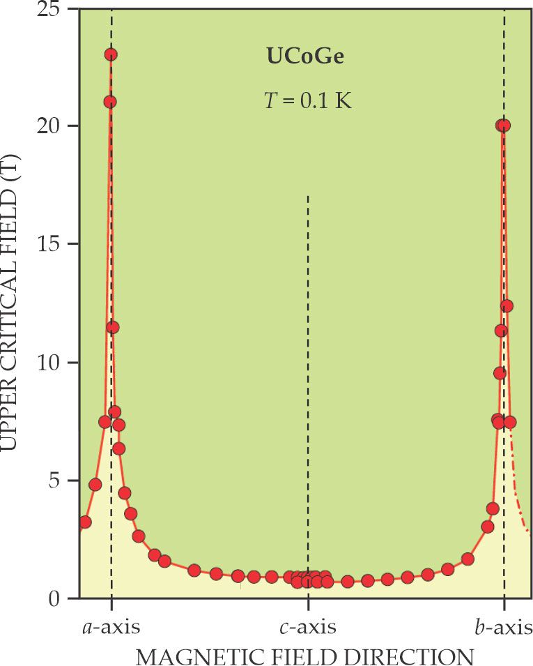 An important ingredient in the models is the low dimensionality of the spin fluctuations along the direction of the magnetic moment (see figure 1). The uniaxial nature of the moments imposes a precise tuning of the magnetic field direction in single crystal samples. For UCoGe and URhGe, that tuning was demonstrated by magnetic-field angle-dependent transport measurements that probed the superconducting transition via electrical resistance.