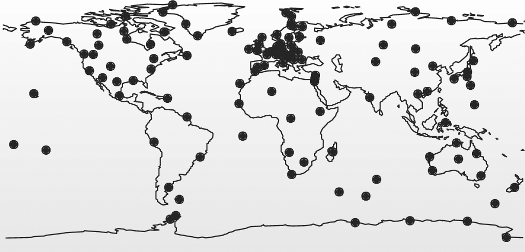 Figure 2. Worldwide distribution, as of 2006, of magnetic observatories that report one-minute-average digital data.