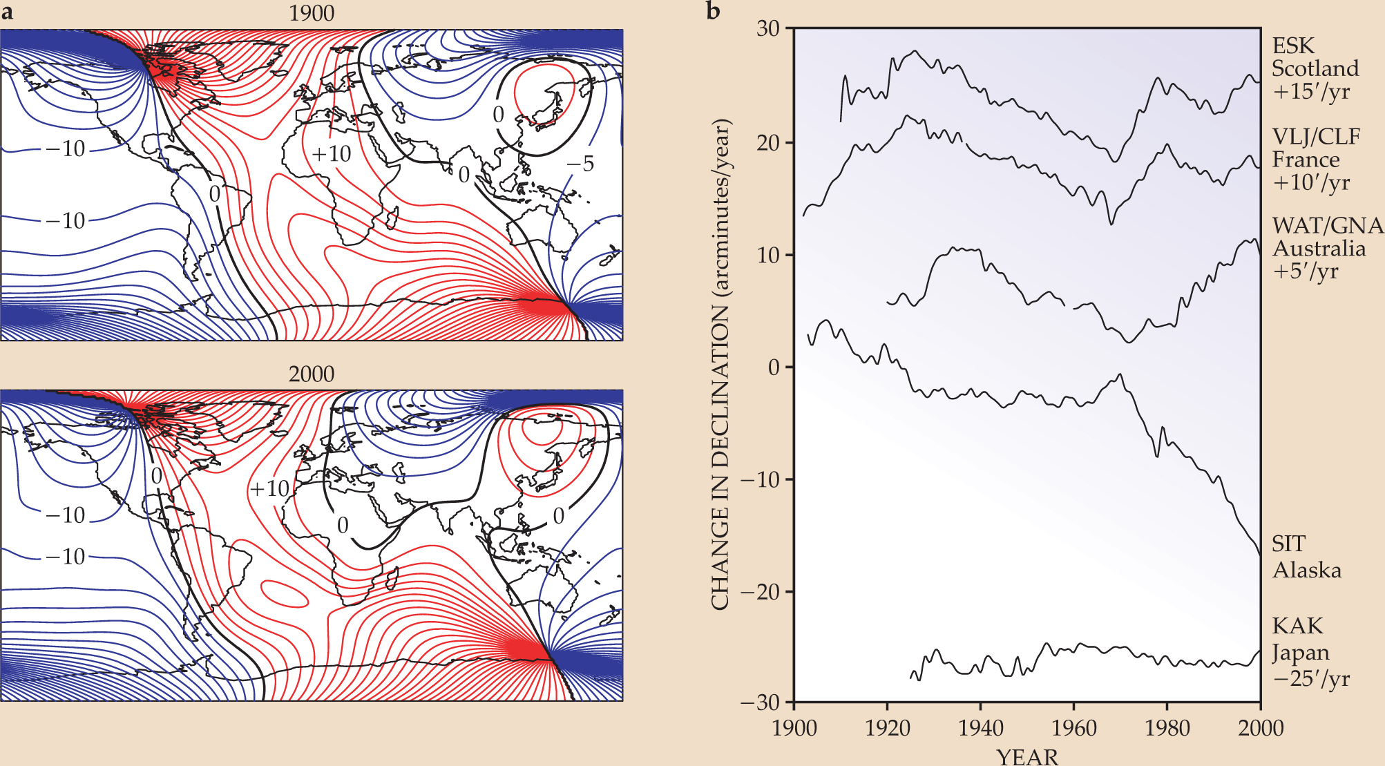Part of the magnetic field generated in the core extends outward, passes through the weakly electrically conducting mantle, and reaches the surface. The field at Earth’s surface typically has an intensity of 30 000–60 000 nT and is approximately dipolar, with an axis tilted by about 10° with respect to Earth’s rotational axis. But the magnetic field also has important ingredients that are nondipolar. One way to appreciate that is to make a map of declination. The compass needle aligns itself with the horizontal direction of the local magnetic field. As figure 3(a) shows, a compass needle almost never points due north. Indeed, because of the nondipolar field, declination is a complicated function of latitude and longitude. As a result of core convection, the magnetic field also exhibits secular variation over time scales of decades to millions of years. And so, at a given location, the direction that a compass points changes over time. The two maps of declination in figure 3(a) show the progression of geomagnetic secular variation over the past century. 4 Indeed, because the field changes in time, maps of it are updated every five years or so.