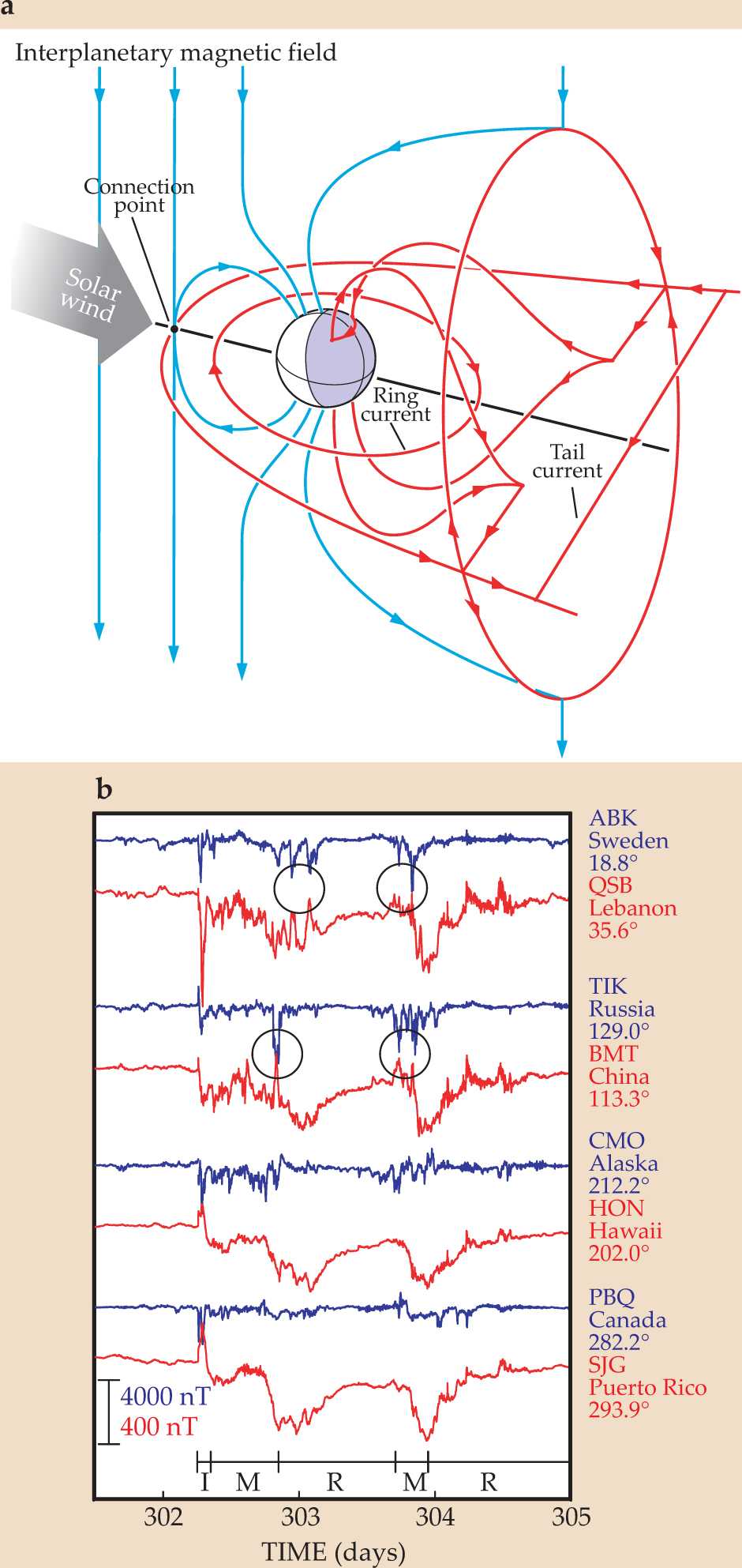 Figure 6. Earth’s magnetosphere is shaped and controlled by the Sun. (a) Schematic representation of the magnetosphere. Blue lines represent magnetic fields, and red lines represent currents. Magnetic connection is shown on the day side of the magnetosphere, where a southward-pointing interplanetary field merges with a northward-pointing geomagnetic field. (b) Data from eight observatories show the disturbed horizontal intensity H during the Halloween magnetic storm of 28–31 October 2003. The magnetograms are arranged by longitude; red traces correspond to low-magnetic-latitude observatories and blue lines to observatories at high latitudes. The initial (I), main (M), and recovery (R) phases are discussed in the text. The circled anticorrelations between high- and low-latitude magnetograms are indicative of substorms.
