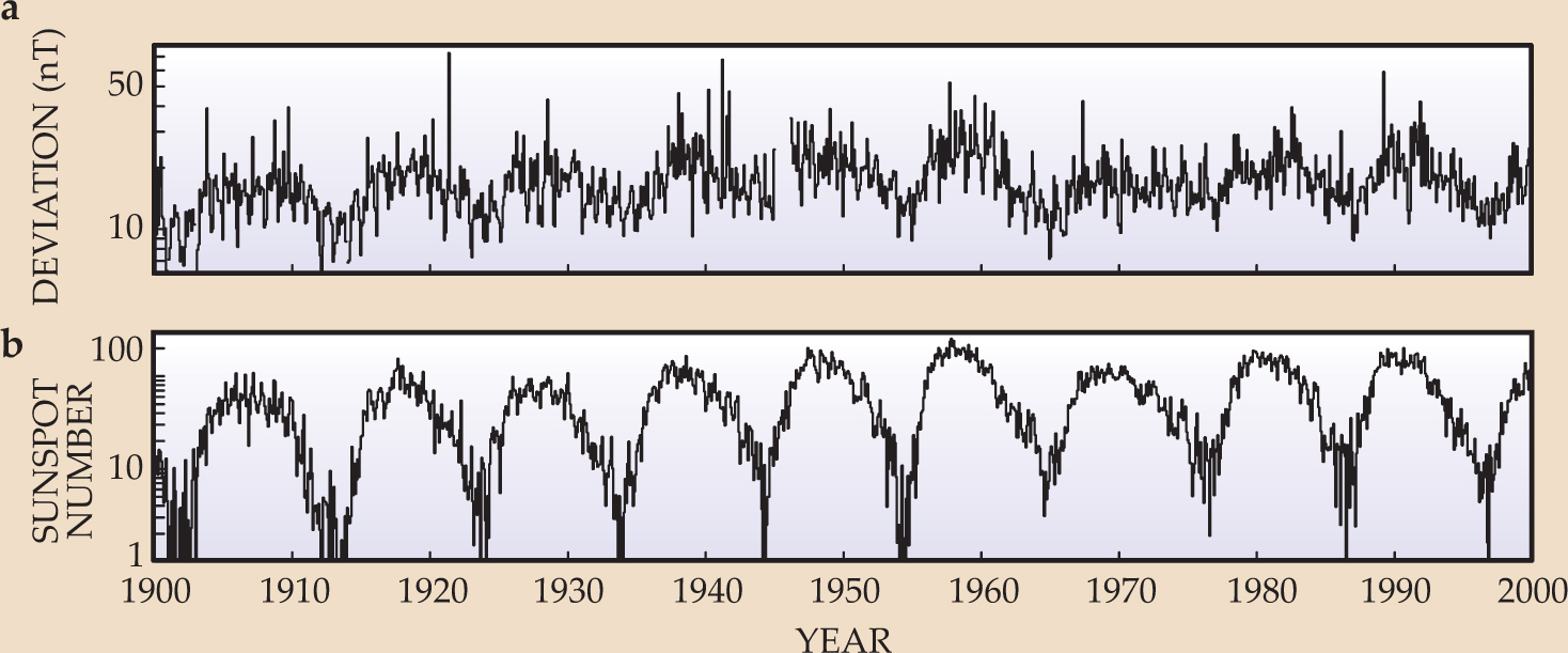 Figure 7. Magnetic activity is driven by the Sun. (a) The monthly standard deviation in the horizontal intensity H as measured at German observatories. (b) Monthly averages for sunspot number.