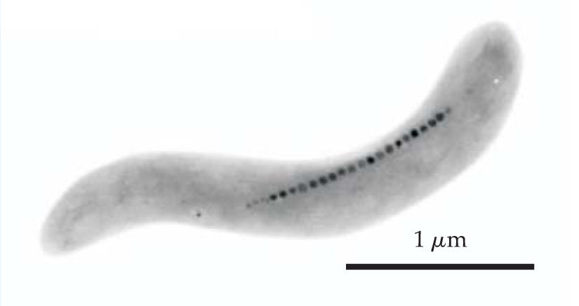 Figure 2. Bacterial magnetoreceptors. Transmission electron micrograph of the bacterium Magnetospirillum magnetotacticum showing the chain of magnetosomes inside the cell. The magnetite crystal incorporated in each magnetosome is about 42 nm long.
